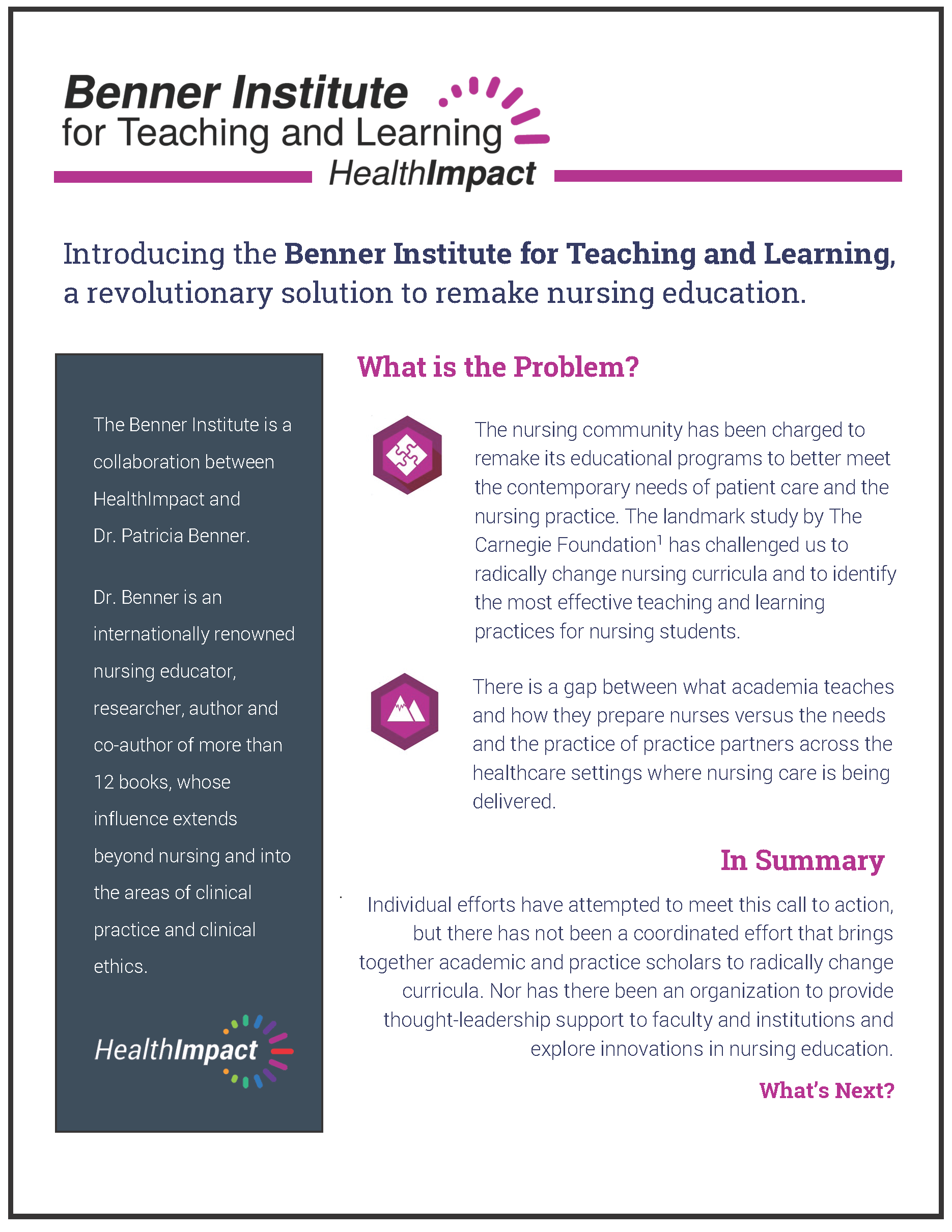 Individual efforts have attempted to meet this call to action, but there has not been a coordinated effort that brings together academic and practice scholars to radically change curricula. Nor has there been an organization to provide thought-leadership support to faculty and institutions and explore innovations in nursing education.